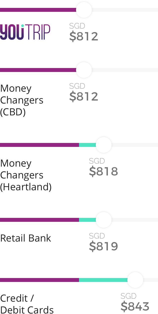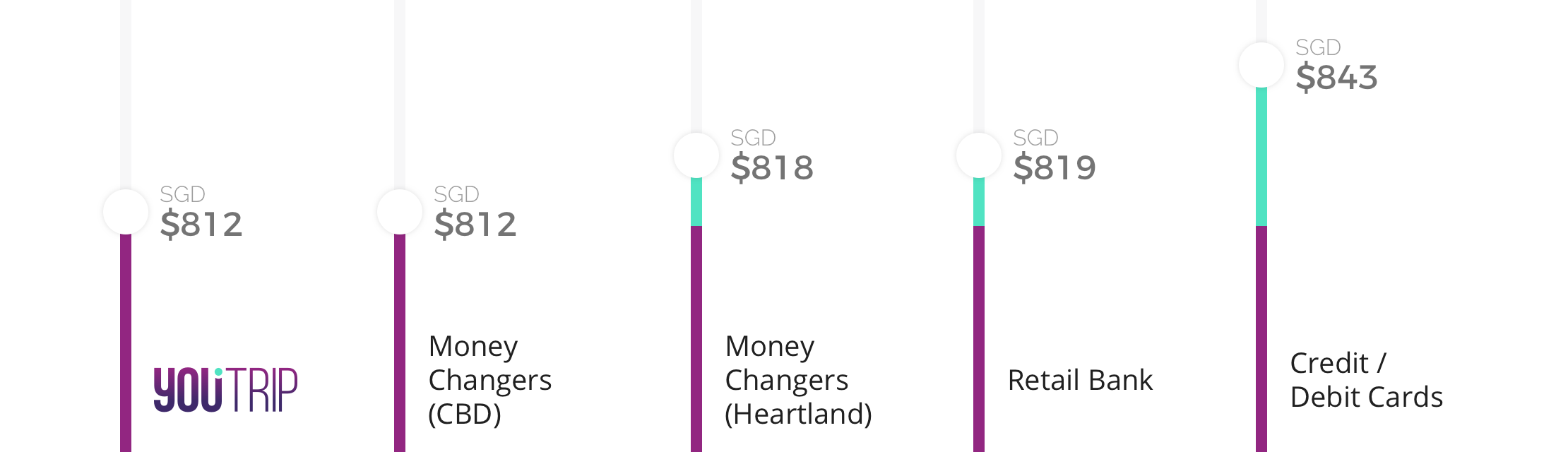With your YouTrip card you can withdraw cash at all overseas Mastercard, Maestro or Cirrus ATMs outside Singapore at wholesale exchange rates. A withdrawal fee of SGD5 or foreign currency equivalent will apply.