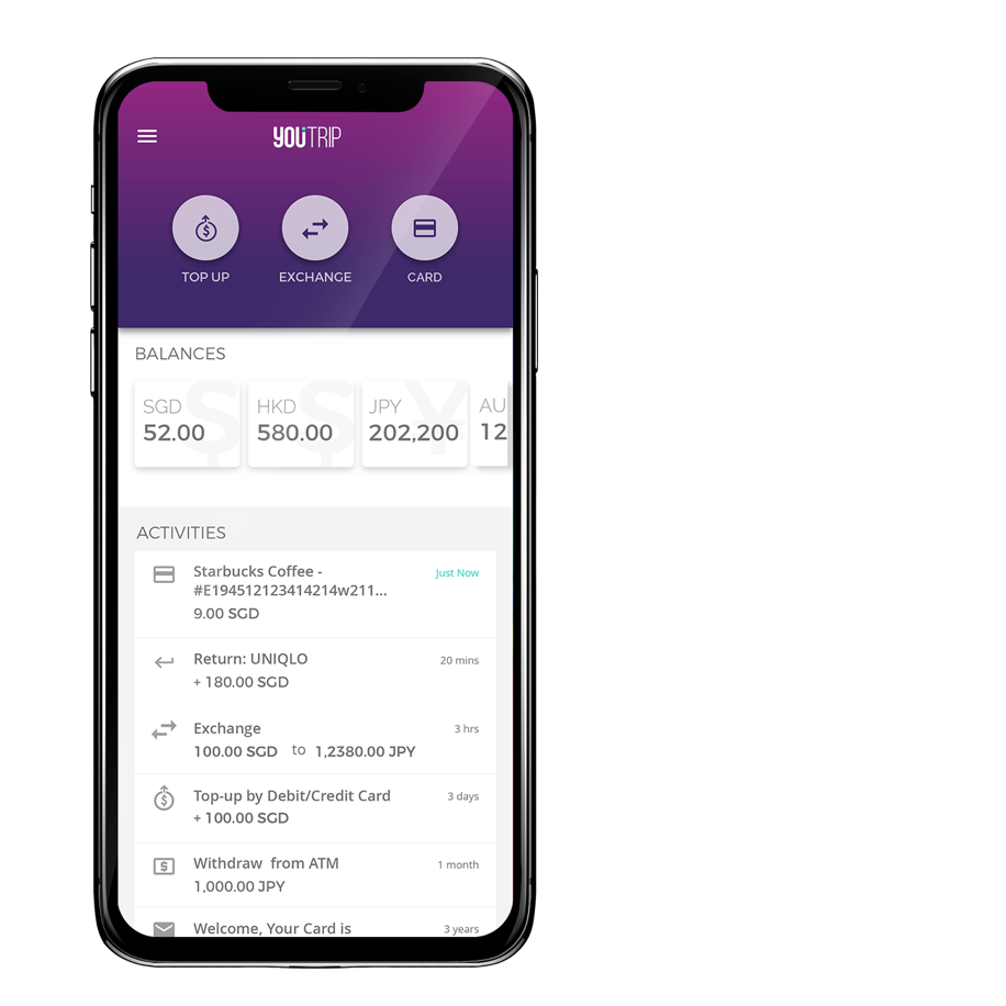 Top up your YouTrip wallet on your mobile phone with any SGD credit or debit card for up to SGD3,000.